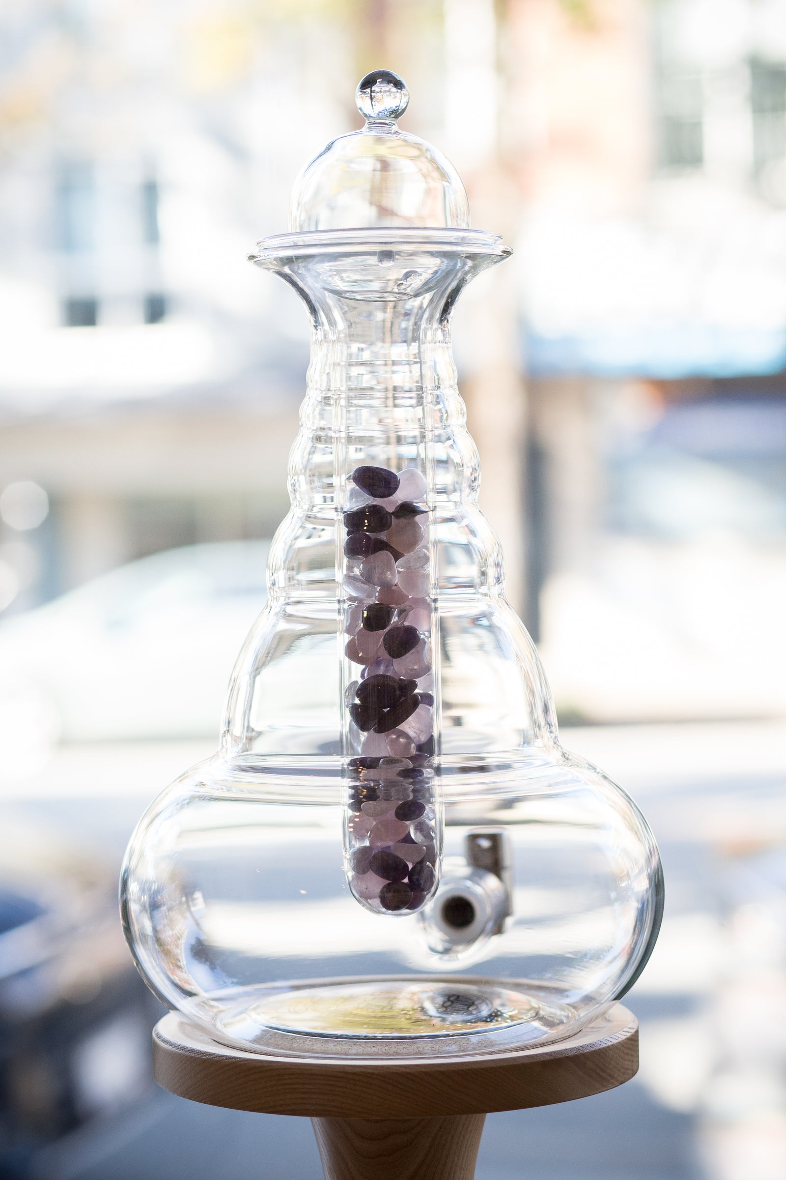 The Beauty Platinum is an elegant hand-blown beverage dispenser made of borosilicate glass. Each dispenser comes with a removable inner glass tube for safely introducing the effects of crystals, ice cubes, flowers or other structuring elements to your water.